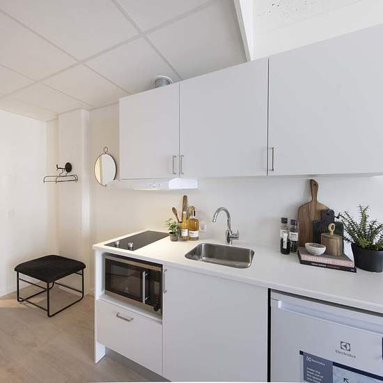 Her på Campus Aviator finder du en unik boligoplevelse, hvor fællesskab og hygge er i fokus. Boligerne består af moderne 1- og 2-værelses lejligheder, hvor der er plads til både privatliv og sociale aktiviteter. Ejendommen består af fire boligblokke, der er forbundet af den imponerende panoramabro, også kendt som "Guldbarren". På de store tagterrasser kan du nyde en fantastisk udsigt over området og slappe af i solen sammen med dine naboer. Her tilbydes en række unikke fællesfaciliteter, herunder møblerede fællesrum, et stort fælleskøkken me...