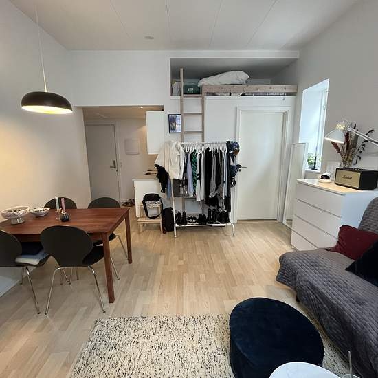 Velkommen til denne fine 1-værelses lejlighed centralt i Aalborg. Praktisk planløsning med eget køkken og bad Lyst leverum med adgang til hems God skabsplads i køkken og badeværelse Fælles tagterrasse til hyggelige stunder Adgang til fællesvaskeri og kælderrum Uopsigelighed de første 12 måneder Boligen Denne lejlighed på 37 m² byder på en lys stue, der fungerer som leverum, og en hems, som kan bruges til soveværelse eller opbevaring. Entréen fører ind til et rummeligt badeværelse og et funktionelt køkken med to kogeplader og kombiovn. Køk...