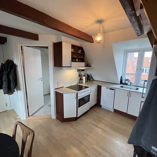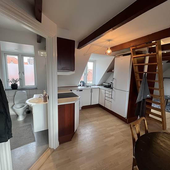Charmerende 1-værelses på attraktive Frederiksbjerg Charmerende 1-væresles taglejlighed med højt til loftet, fritliggende bjælker og hems med ovenlysvinduer. Lejligheden byder på et veludstyret køkken med opvaskemaskine, komfur, kølefryseskab og emhætte. Lejligheden er rummelig med plads til både spisebord og sofa. Badeværelset er lyst og rummeligt og udstyret med bruseniche. I kælderen er der fællesvaskeri og opbevaringsmuligheder. Derudover er der et hyggeligt gårdanlæg til fællesbrug. Udgiften til vand er inkluderet i huslejen. Lejlighe...