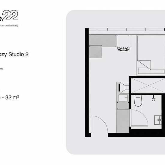 Om Studio 22 Studio 22 er et moderne bofællesskab skabt til studerende og young professionals under 35 år. Her får du både privatliv og fællesskab – med madklubber, kreative værksteder, studieområder og hyggelige lounges. Du kan reparere din cykel, lave kreative projekter, deltage i sociale events – eller bare slappe af i din egen bolig. Din bolig indeholder - Fuldt møbleret: skrivebord, lampe, stol, gardiner, garderobeskab og opbevaring - Eget badeværelse med bruser, håndvask og toilet - Lille tekøkken med kogeplade, emhætte, vask og køle...
