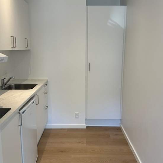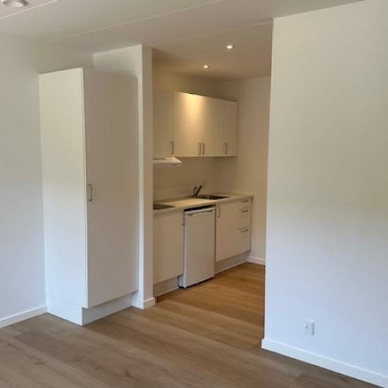 Nybygget i Centrum 1 værelses lejlighed . Dejlig lys lejlighed i centrum udlejes . Indeholder køkken med hvidt Hth køkken med masser af skabsplads , kogeplader og køleskab med lille fryser . Stue med gode lysindfald og flot lyst trægulv. Toilet med stor brucheniche og lysefliser på gulvet med gulvvarme, også her er der hvidt Hth toilet møbel. Der er vaskeri samt cykelparkering i kælderen.