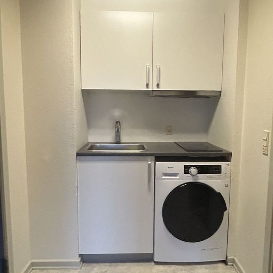 Nyistandsat et værelses lejlighed. I lejligheden er et hvidt Kvik køkken med køle-fryseskab, keramisk kogeplade og en vaske-tørremaskine. Der er en stue med indbygget skab og et rummeligt badeværelse.