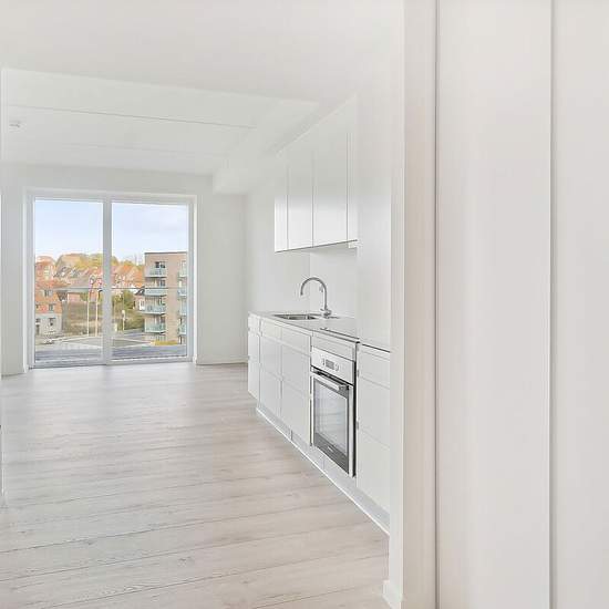 Lejlighederne varierer i størrelse fra 1 til 5-værelser. Du træder ind i entréen, hvorfra der er adgang til boligens køkken-alrum i direkte forbindelse med stuen. Fra køkken-alrummet har størstedelen af lejlighederne udgang til en altan eller terrasse, og de sydvendte gavllejligheder har endda store udeområder med udsigt over vandet. Der er anvendt store vinduespartier på tværs af ejendommen, som skaber optimalt lysindfald i lejlighederne og byder den unikke udsigt ind i boligerne. Fra køkken-alrummet er der adgang til boligens separate være...