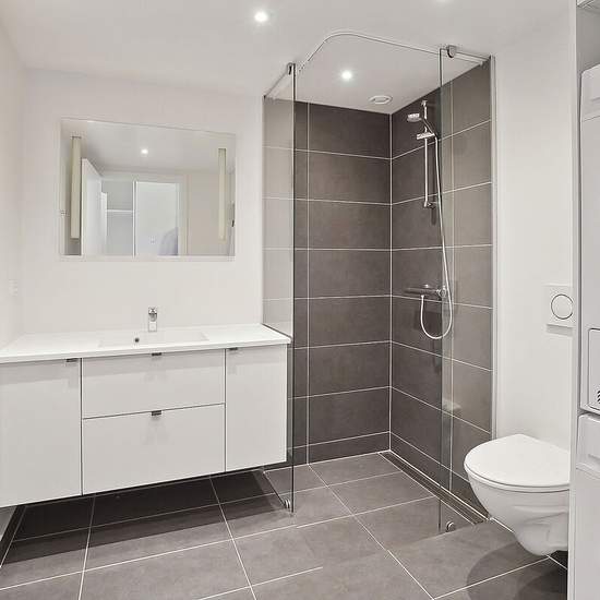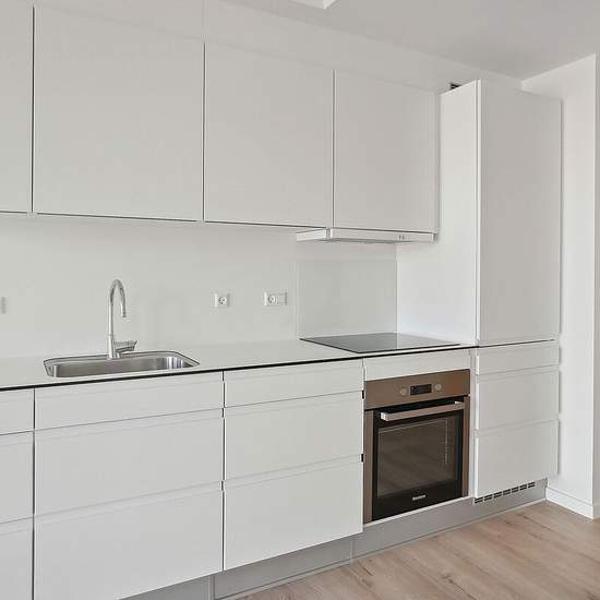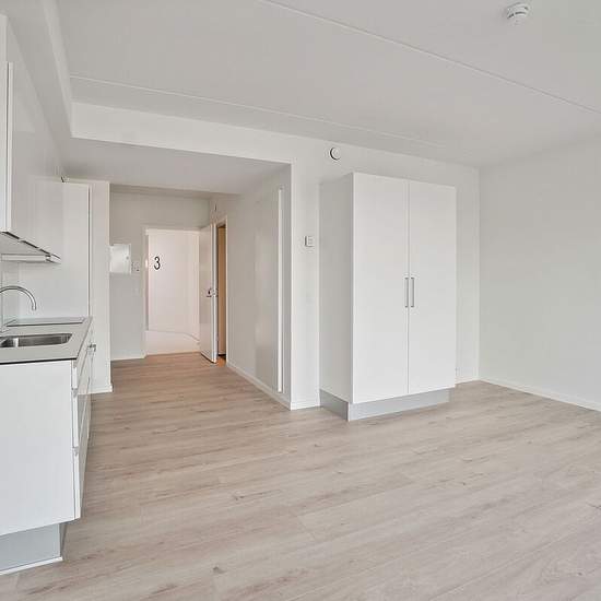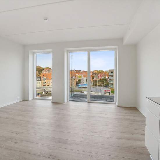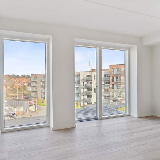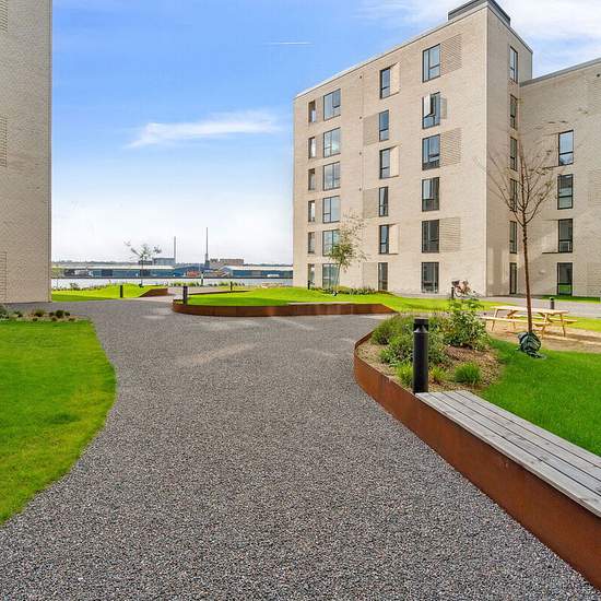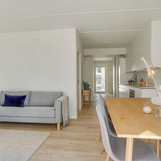 Lejlighederne varierer i størrelse fra 1 til 5-værelser. Du træder ind i entréen, hvorfra der er adgang til boligens køkken-alrum i direkte forbindelse med stuen. Fra køkken-alrummet har størstedelen af lejlighederne udgang til en altan eller terrasse, og de sydvendte gavllejligheder har endda store udeområder med udsigt over vandet. Der er anvendt store vinduespartier på tværs af ejendommen, som skaber optimalt lysindfald i lejlighederne og byder den unikke udsigt ind i boligerne. Fra køkken-alrummet er der adgang til boligens separate være...