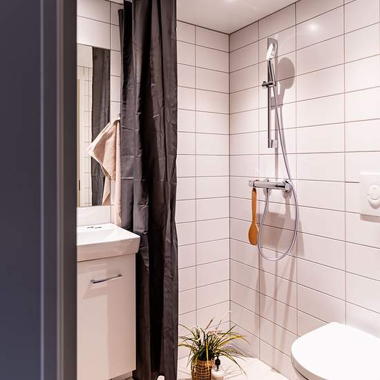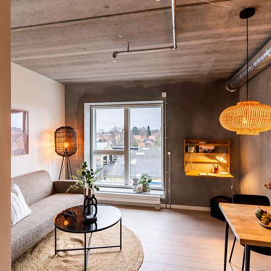 Flot og moderne studiebolig Dette flotte og moderne kollegieværelse er stort og lyst, med plads til både spisning, sofa og seng. Herudover er der højt til loftet, og en unik stil med rå betonvægge. Det mindre køkken indeholder køleskab, kogezone, emhætte. Badeværelset er rummeligt og lyst og med bruseniche. På hver etage er der stort fælleskøkken til fri benyttelse, og hvor man kan sidde og nyde sin mad med de øvrige beboere eller sin familie. Derudover er der fællesvaskeri, plads til cykler samt opbevaringsmuligheder. Lejligheden er belig...