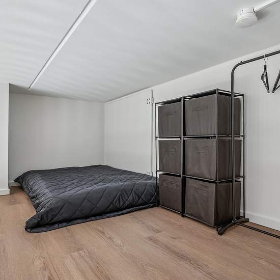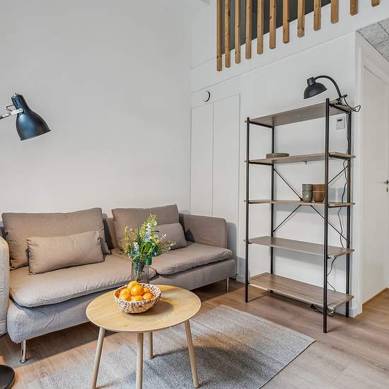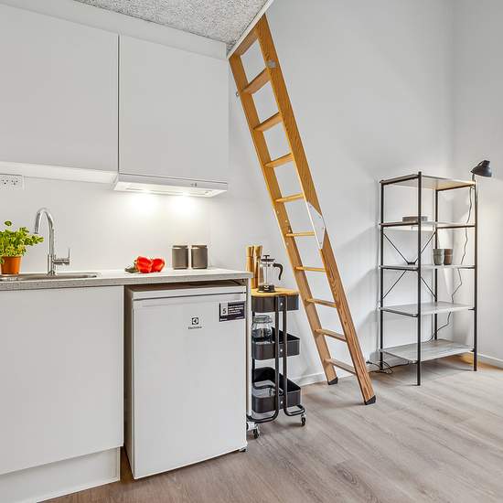 Moderne og flot 1-værelses lejlighed med hems Denne 1-værelses lejlighed ligger i stueetagen, og den er indrettet med eget tekøkken, der er udstyret med en 2-zoners kogeplade og et køleskab med fryseboks samt emhætte. I lejligheden er der højt til loftet, en hyggelig hems og en privat terrasse. Derudover er der eget badeværelse med separat bruseniche og et toilet. Ejendommen har flere fællesarealer både indendørs og udendørs. Indenfor finder man tre større fællesrum, der primært fungerer som fællesvaskeri. Der er dog også placeret enkelte b...