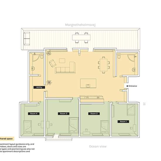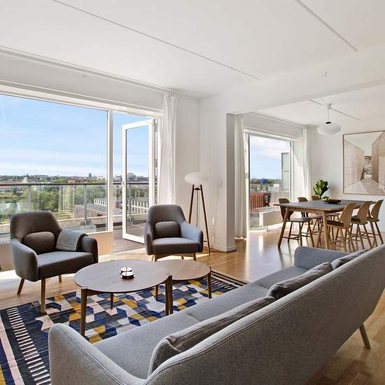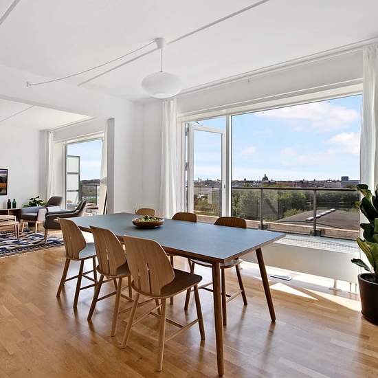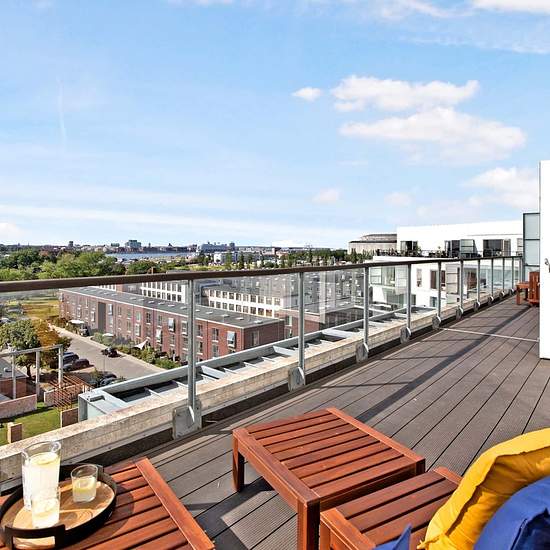Description - space If you ever wanted to live on city island, with views to a ski slope, now you can. You live in the historical, green area Margretheholm, which used to be the home of the naval air station in 1915. Vandkunsten Architects designed this elegant top floor apartment. Wake up with the sun rising over the ocean, and finish the day with a drink and evening sun on the enormous terrace with breath-taking views of the Copenhagen harbor. You will never be bored on Refshaleøen. Hang out in trendy art galleries, the famous food market ...