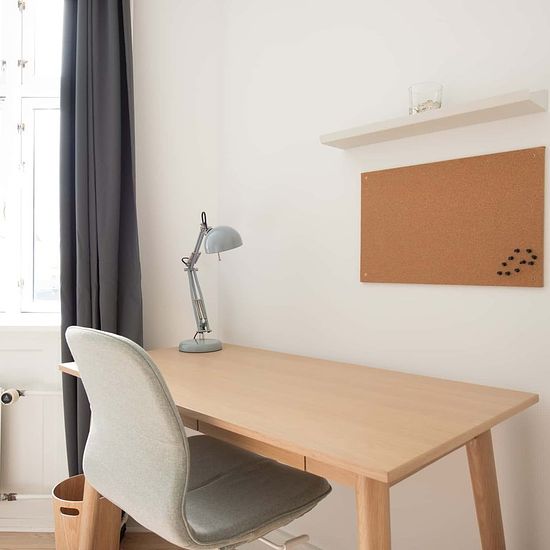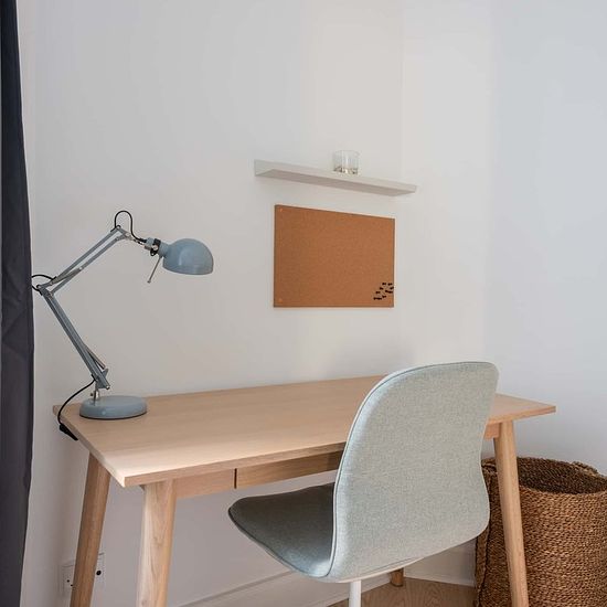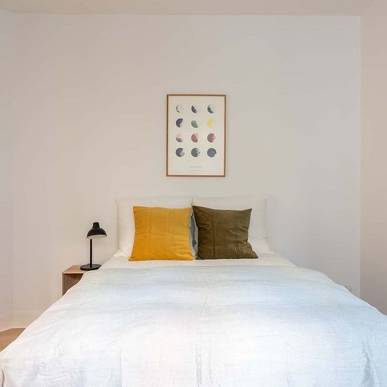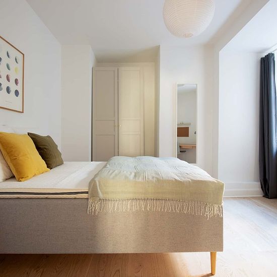 High-quality bed with bedspread, duvet and pillows. Bedside table with reading lamp. Desk with desk chair and desk lamp. Wardrobe with drawers and hanging space. Storage boxes underneath the bed. Curtains, mirror, laundry basket, trash can, rugs and decoration (not all on photos) 1) cancellation made 60 or more days before the Check-in date: For the Tenant: reimbursement of 100% of the First Instalment minus the amount of the Roomless Fees. 2) cancellation made between the 59th and 30th day before the Check-in date: For the Tenant: refund o...