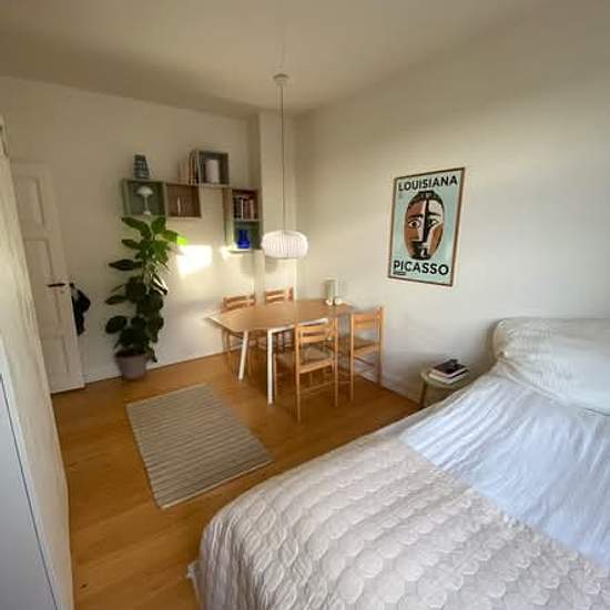 **Fremleje af møbleret værelse på Trøjborg** Da jeg skal ud at rejse, fremlejer jeg mit dejlige, møblerede værelse på Trøjborg i perioden **15. januar – 1. maj 2026** (slutdato kan aftales). **Om værelset:** * Ca. 16 m² og fuldt møbleret * Beliggende ud mod en rolig og stille baggård * Fælles gang, toilet og køkken med opvaskemaskine * Vaskemaskine og tørretumbler til fri afbenyttelse i opgangens kælder * Cykelkælder til parkering af cykel **Beliggenhed:** * Lejligheden ligger på Nordre Ringgade og dermed i gåafstand til bl.a. Tordenskjol...