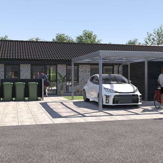 Lys, enkelthed og grønne omgivelser Moderne bolig på 75 m², hvor funktionalitet og atmosfære smelter sammen. Her er hver kvadratmeter udnyttet til fulde, og du får en bolig, der indbyder til både roligt hverdagsliv og hyggelige stunder med gæster. Boligen Hjemmets hjerte er det store køkken/alrum og stue. Med åbent layout og plads til både spisebord og sofaområde er her rig mulighed for at samle familie og venner. De store vinduespartier skaber et lyst og luftigt rum, hvor udelivet nærmest flytter indenfor. Det store soveværelse er indre...
