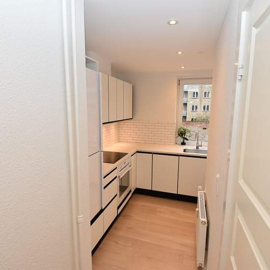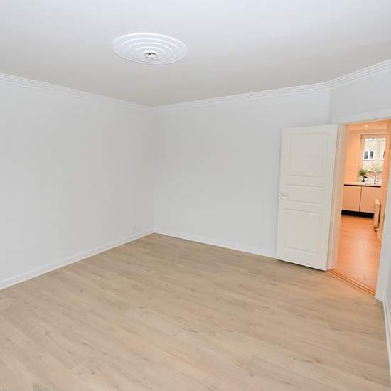 Nyrenoveret lejlighed ø-gaden! Indretning: – Entré med adgang til alle rum. – Stor og let indrettelig stue med godt lysindfald fra stort vinduesparti. – Stort og lyst soveværelse med nye gulve – NYERE køkken med lyse skabselementer , ovn, emhætte, opvaskemaskine og køle-/fryseskab. – NYERE badeværelse med blandt andet gulvvarme Fælles vaskeri Lejligheden er nymalet ved indflytning. Det er en ikke ryger lejlighed.