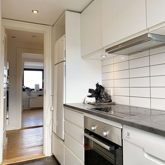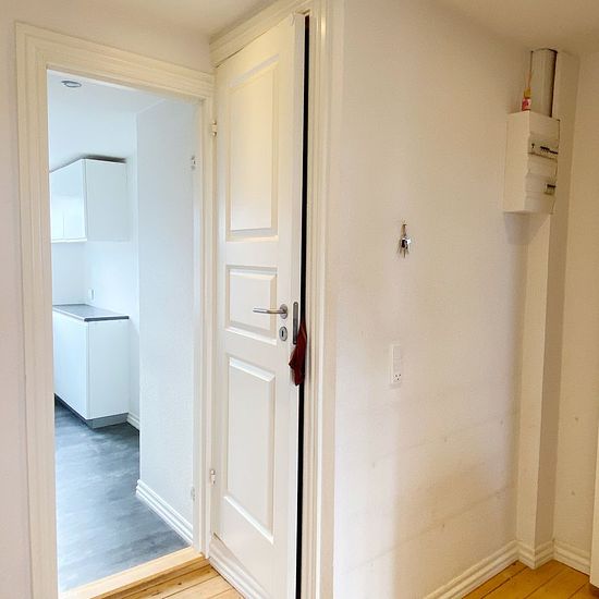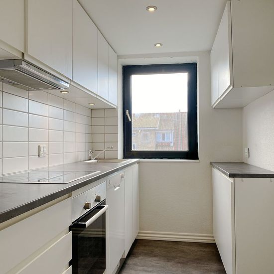 Der er lejligheder, og så er der lejligheder med udsigt. Denne er af den anden slags. Fra 4. etage på Peder Skrams Gade 19 åbner der sig et panorama over Limfjorden og havneområdet, som du ikke bliver træt af – hverken om morgenen med kaffen eller om aftenen, når himlen over vandet skifter farve. Lejligheden er på 52 m² med to rum, trægulve og et velholdt hvidt køkken med Electrolux ovn, induktionskogeplade og opvaskemaskine. Badet er nyrenoveret med store fliser og moderne armatur – klar til indflytning. Fra køkkenets eget vindue kigger d...