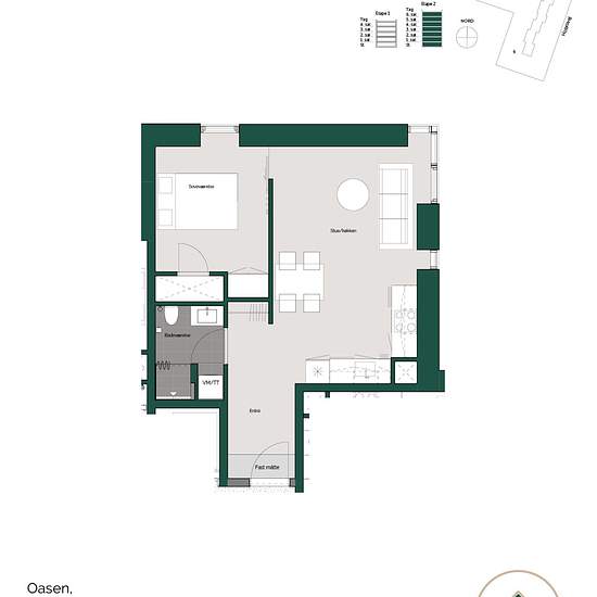 Her er muligheden for at leje en skøn 2-værelses lejlighed i Oasen. Lejligheden er indrettet med stor bred entre, hvor der er mulighed for at komme af med sko og overtøj i en indbygget garderobe med LED-lys. Fra entreen er der direkte adgang til køkken og stue, hvor køkkenet indeholder køle-/fryseskab, komfur, ovn og opvaskemaskine, og herudover er der både god skabsplads og bordplads. Fra stuen er der adgang til soveværelset, som har indbyggede skabe. I lejlighedens badeværelse, som er godt udnyttet, er der installeret både vaskemaskine og ...
