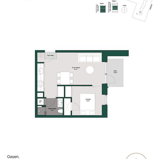 Her er muligheden for at leje en skøn 2-værelses lejlighed i Oasen. Lejligheden er indrettet med entre, hvor der er mulighed for at komme af med sko og overtøj i en indbygget garderobe med LED-lys. Fra entreen er der direkte adgang til køkken og stue, hvor køkkenet indeholder køle-/fryseskab, komfur, ovn og opvaskemaskine, og herudover er der både god skabsplads og bordsplads. Fra stuen er der adgang til soveværelset, som har indbyggede skabe, og hvor man kan ligge i sengen og kigge ud over hele den grønne Oase. I lejlighedens badeværelse, s...