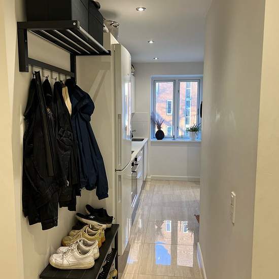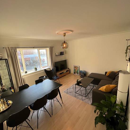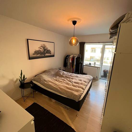 Lys og moderniseret lejlighed med altan Denne flotte lejlighed byder på et super moderne køkken med alle hårde hvidevare såsom opvaskemaskine, indbygningsovn, køle/frys, keramisk kogezone og emhætte. Derudover byder lejligheden på en lys og rummelig stue samt et dejligt værelse, hvor man har udgang til en hyggelig altan. Badeværelset er moderne og istandsat med flotte lyse klinker, og det indeholder både vaskemaskine og tørretumbler. OBS. Plantegningen er vejledende og billederne er fra en tilsvarende lejlighed i ejendommen. Vand er inklud...