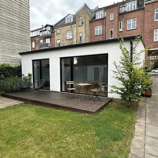Beskrivelse Unikt 2-værelses byhus i roligt gårdmiljø – i Øgadekvarteret, midt i Aarhus C Dette attraktive 2-værelses byhus i ét plan, opført i 2018, fremstår moderne og indbydende med en velindrettet planløsning. Boligen har et stort og lyst opholdsrum med Tvis-køkken i åben forbindelse med stuen. Soveværelset er rummeligt og indrettet med indbyggede skabe. Fra både stue og soveværelse er der direkte udgang til en stor, privat træterrasse, hvor udelivet kan nydes i rolige og ugenerede omgivelser. Det store badeværelse er stilrent udført...
