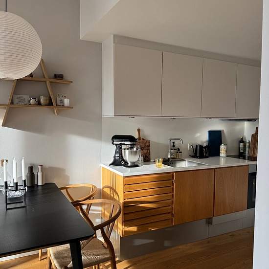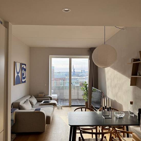 Denne 2-værelses lejlighed er perfekt til singlen eller parret, der sætter pris på kvalitet og beliggenhed. Der bydes velkommen i entre, hvorfra der er adgang til lejlighedens lækre badeværelse og køkken-alrum/ stue. Badeværelset er med stor bruser, vaskesøjle samt skabs arrangement med håndvask. Køkkenet har et moderne look og grebsfrie fronter i træ, hvide pæne overskabe og en hvid bordplade. Her er der god opbevaringsplads. Her er der også alt i hårde hvidevarer. Stuen har også en fin størrelse og med store vinduespartier. Soveværelset er...