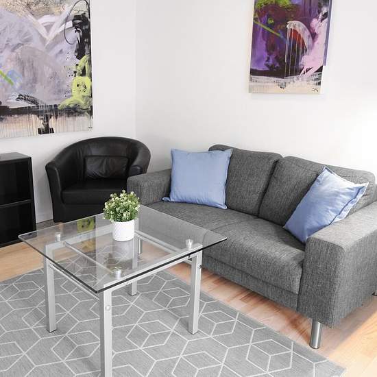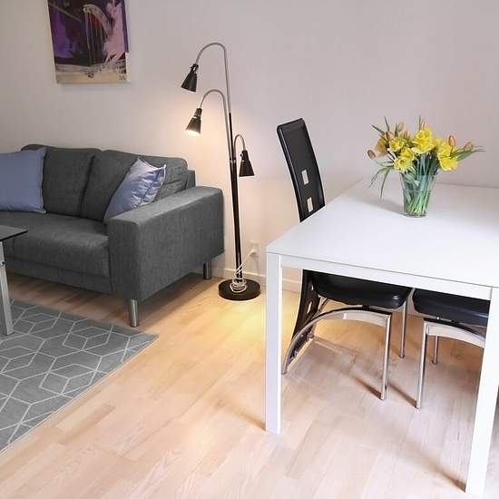 Toværelses lejlighed beliggende i Aarhus Centrum, tæt ved Musikhuset. Lejligheden er indrettet med køkken i åben forbindelse med stuen. Køkkenet er med lyse låger og indeholder køleskab med frostboks, mikroovn, kogeplader og varmluftovn. Stuen er let indrettet med sofa, sofabord og lænestol. Fra stuen er der udgang til gården hvor der er adgang til et fælles møntvaskeri. Soveværelset er udstyret med to gode enkeltsenge og et stort garderobeskab med masser af skabsplads. Lejligheden har godt badeværelse med bruseniche, sort granit på gulv...