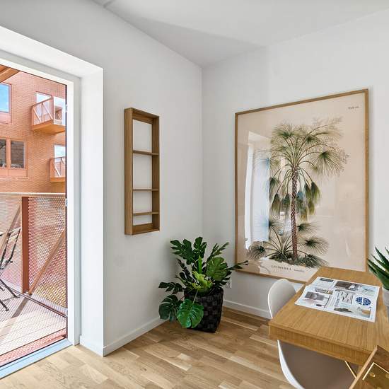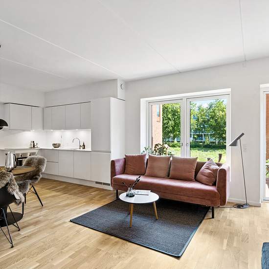 INDBYDENDE LEJLIGHEDER I NORDISK OG STILRENT DESIGN Alle lejligheder er indrettet i en indbydende, nordisk stil med hvide vægge og et fantastisk lysindfald fra glaspartier ud mod altan eller terrasse. Det samme gælder værelserne, der er designet med vinduer med små brystninger, så du har god mulighed for at nyde udsigten. De lyse trægulve tilfører boligen varme, mens køkkenet er designet med lysegrå underskabe som en kontrast til det hvide. Med altan eller terrasse til alle lejligheder har du mulighed for at nyde dit eget private uderum. De...