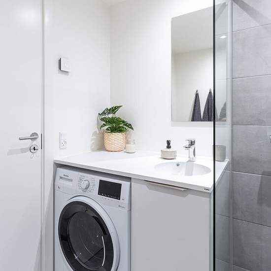 Rummelig og lækker toværelses lejlighed med sammenhængende køkken-alrum, hvor der både er køkken, spiseplads samt stue. Køkkenet er opført i lyse, stilrene materialer og indeholder alt i hårde hvidevarer. Lejligheden er indrettet med et stort og rummeligt soveværelse med god plads til en dobbeltseng samt tre faste garderobeskabe. Lejligheden indeholder et enkelt badeværelse i moderne stil. Rummet indeholder bruseniche, toilet, håndvask samt vaskesøjle med vaskemaskine og tørretumbler. Fra køkken-alrummet er der direkte udgang til boligens eg...