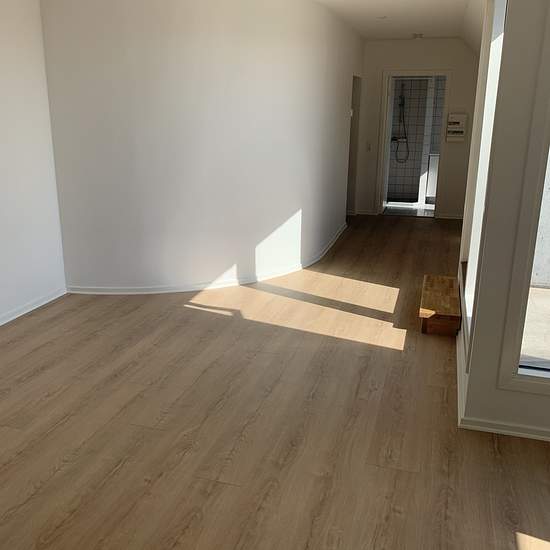 Denne flotte lyse taglejlighed, med dørtelefon, har egen lækre indbyggede tagterrasse. Her kan man sidde uforstyrret og nyde udsigten over Rådhustorvet. Til venstre for entreen, er lejemålets toilet. Badeværelset er nemlig opdelt i to rum. Fortsætter man ind i stuen, finder man på højre hånd det rummelige badeværelse, hvor der er plads til opsæt af egen vaske/tørremaskine. Fra den lyse stue kan man tilgå terrassen samt det charmerende køkken, med smukke mørke træbordplader. Der er desuden indbygget opvaskemaskine. I enden af stuen er sov...
