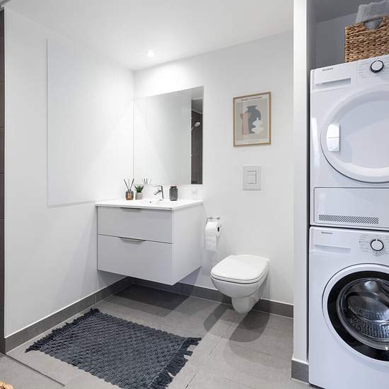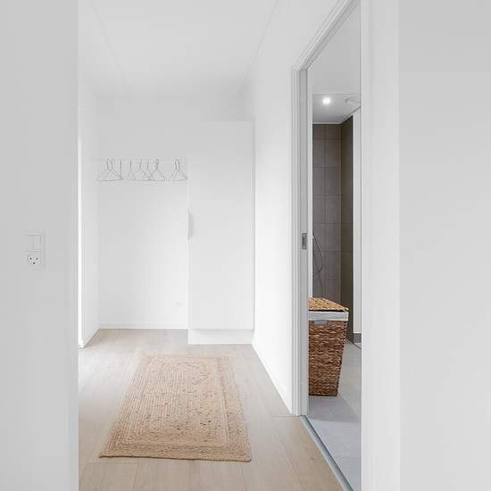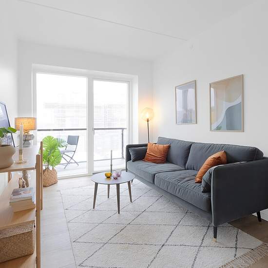 Lys og rummelig toværelses lejlighed med stort køkken-alrum og stue, stort soveværelse og egen altan. Til boligen hører eget skur.