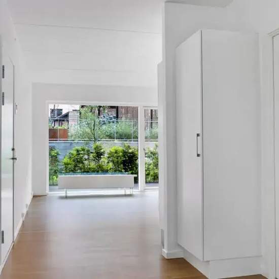 Lejligheden Lejligheden fremstår lys og rummelig og er opført i klassiske og tidssvarende materialer. Stue og køkken ligger i forlængelse af hinanden og skaber et stort åbent rum der giver maksimalt udbytte af det fantastiske lysindfald. Det moderne og praktiske køkken er fra Invita og byder blandt andet på ’svævende’ bordplade med højtrykskomposit, LED-spots og integrerede hvidevarer – alle fra Siemens. Fra gangen har du adgang til det indbydende badeværelse med gulvvarme, formstøbt og integreret marmorvask, væghængt toilet samt vaskemaskin...