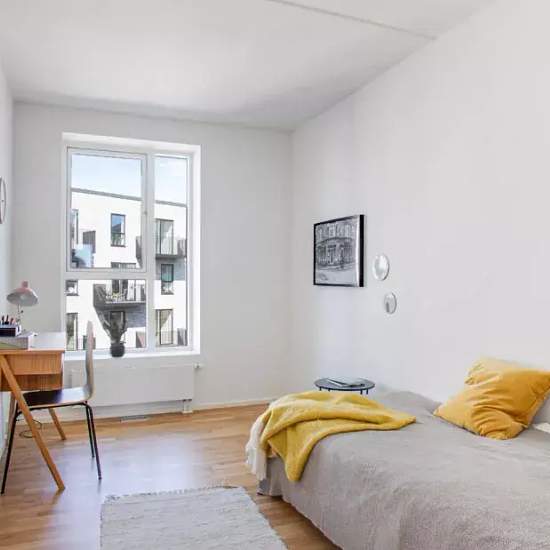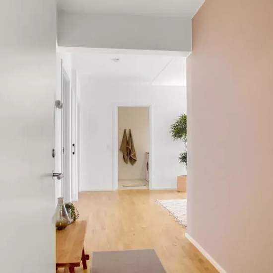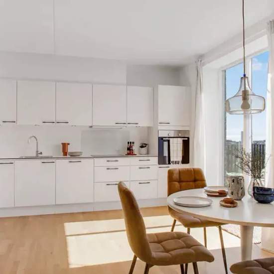 Lejligheden Lejligheden er opført i skandinavisk stil, der får den til at fremstå moderne, lys og indbydende. De store vinduer lukker store mængder dagslys ind og skaber derved en varm atmosfære og et flot spil på det lyse egetræsgulv. Lejlighedens hjerte er et centralt opholdsrum med åbent køkken og spiseplads. Det diskrete, hvide køkken er fra Invita med hårde hvidevarer fra Siemens. På badeværelset er der fliser på gulvet og i brusekabinen. Der er desuden vaskemaskine og tørretumbler fra Siemens. I mastersoveværelset findes indbyggede ska...