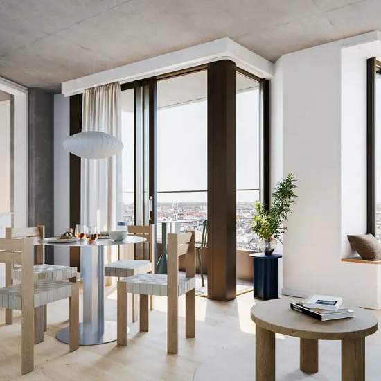 Nu er det muligt at blive den første lejer i et af Postbyens runde tårne. Tårnene er allerede blevet et nyt vartegn for den centrale del af København og nu har du mulighed for at bo i et af dem. Der er indflytning allerede fra februar 2026 og boligerne varierer i størrelse fra to til syv værelser hvor alle har altaner med udsigt ud over byens liv. I Postbyen bor du i et helt nyt levende bykvarter med hoteller, butikker, restauranter, caféer, og meget mere. Dit nye hjem ligger omgivet af smuk arkitektur, og nedenfor din hoveddør ligger byp...