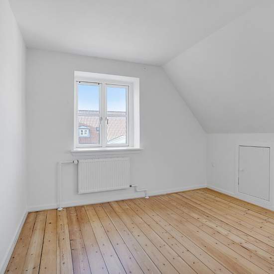 Velkommen til en indbydende 2-værelses lejlighed på 48 m2, beliggende øverst i en klassisk, velholdt ejendom med rødt tegltag og pudsede facader. Her får du et lyst og behageligt hjem med hyggelige skrå vægge, flotte plankegulve og et roligt udtryk – ideelt til én person eller et par, der ønsker sig en overskuelig base med grønne omgivelser lige udenfor. Lejligheden byder på en entré med adgang til alle rum. Opholdszonen består af en stue i åben forbindelse med et velindrettet, hvidt køkken. Køkkenet har god bord- og skabsplads samt opvaske...