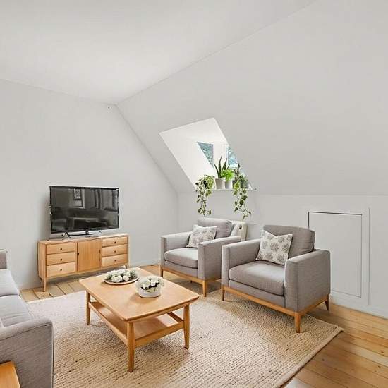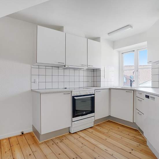 Velkommen til en indbydende 2-værelses lejlighed på 48 m2, beliggende øverst i en klassisk, velholdt ejendom med rødt tegltag og pudsede facader. Her får du et lyst og behageligt hjem med hyggelige skrå vægge, flotte plankegulve og et roligt udtryk – ideelt til én person eller et par, der ønsker sig en overskuelig base med grønne omgivelser lige udenfor. Lejligheden byder på en entré med adgang til alle rum. Opholdszonen består af en stue i åben forbindelse med et velindrettet, hvidt køkken. Køkkenet har god bord- og skabsplads samt opvaske...