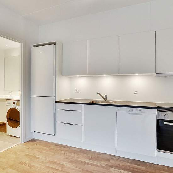 Alle lejligheder har et køkken-alrum i åben forbindelse med stue. I de ét-værelses lejligheder fungerer køkken-alrummet ligeledes som soveværelse. Ellers har du ét eller to separate værelser. Badeværelset er velindrettet med vaskefaciliteter og gulvvarme. Alle lejemål har egen terrasse eller altan. Hårde hvidevarer Boligerne har alt i hårde hvidevarer inklusive vaskemaskine, tørretumbler og opvaskemaskine. Husdyr Lejere kan ansøge om tilladelse til at holde indekat og hund på adressen. Udekatte er ikke tilladt. Se vores samlede husdyrsreg...