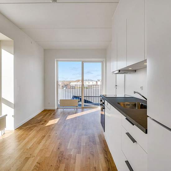 Alle lejligheder har et køkken-alrum i åben forbindelse med stue. I de ét-værelses lejligheder fungerer køkken-alrummet ligeledes som soveværelse. Ellers har du ét eller to separate værelser. Badeværelset er velindrettet med vaskefaciliteter og gulvvarme. Alle lejemål har egen terrasse eller altan. Hårde hvidevarer Boligerne har alt i hårde hvidevarer inklusive vaskemaskine, tørretumbler og opvaskemaskine. Husdyr Lejere kan ansøge om tilladelse til at holde indekat og hund på adressen. Udekatte er ikke tilladt. Se vores samlede husdyrsreg...