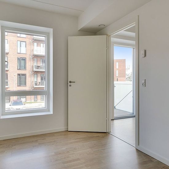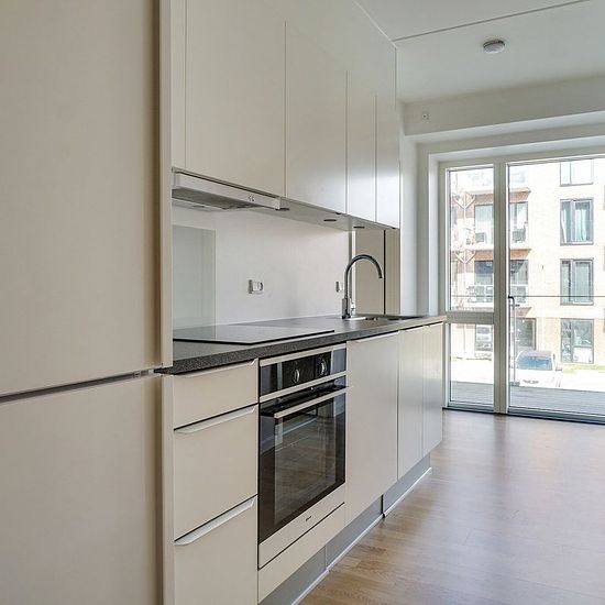 Alle lejligheder har et køkken-alrum i åben forbindelse med stue. I de ét-værelses lejligheder fungerer køkken-alrummet ligeledes som soveværelse. Ellers har du ét eller to separate værelser. Badeværelset er velindrettet med vaskefaciliteter og der er gulvvarme i alle rum. De fleste har egen terrasse eller altan - enkelte lejemål har ikke. Lejlighederne er delevenlige. Hårde hvidevarer Boligerne har alt i hårde hvidevarer inklusive vaskemaskine, tørretumbler og opvaskemaskine. Husdyr Lejere kan ansøge om tilladelse til at holde indekat og...