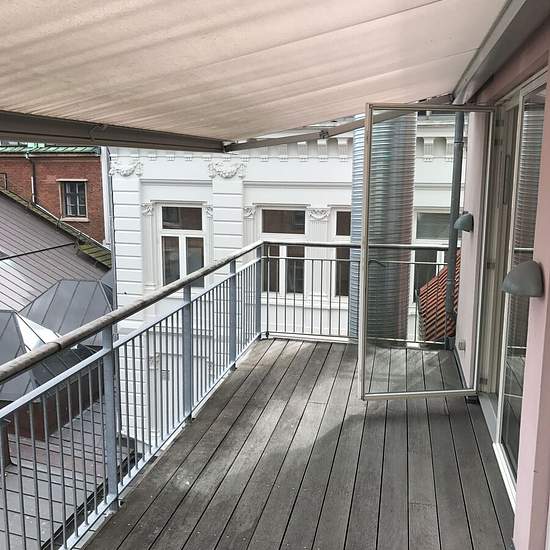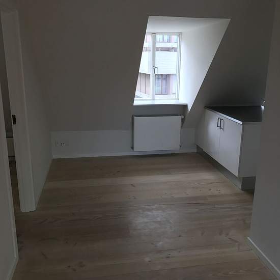 Stor taglejlighed på 82 kvm udlejes. Lejligheden er beliggende på Strøget - med alle midtbyens muligheder lige uden for døren. Lejligheden er totalrenoveret i kvalitetsmaterialer og fremstår i god stand. Lejligheden er total ugeneret og maksimal støjisoleret. Lejligheden indeholder: Entré med stort garderobeskab/opbevaringsrum. Stort badeværelse med bruseniche, skabsarrangement, vaskesøjle. stort køkken med alt i hårdehvidevarer samt spiseplads. Soveværelse med skabe. God lys stue med store vinduespartier og udgang til lækker 15 kvm østvendt...