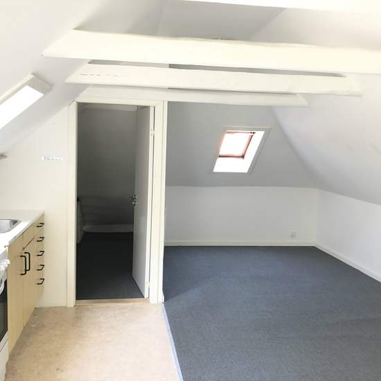 Værelset er på ca. 20 kvm med thekøkken og eget badeværelse i kælderen.