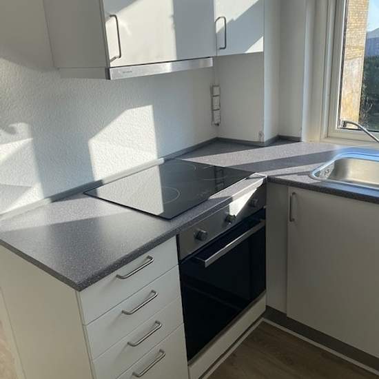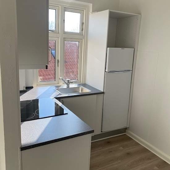 Værelset er på ca. 23 kvm med helt nyt åbent køkken og fælles badeværelse på gangen.