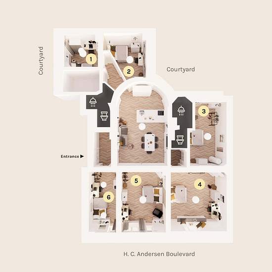 Description - space The apartment consists of 6 single rooms, 2 bathrooms and 1 open kitchen and lounge area. The apartment is located on upper ground floor and has special sound protection windows. The building is from 1894 and has kept the charm of the old days. In room 3, 4 and 5 you’ll still find historic fireplaces and most rooms have stuccoed ceilings. Another highlight of the building is the shared rooftop terrace. Description - area Copenhagen's city centre is definitely the most historic and iconic part of the city with it's small, ...
