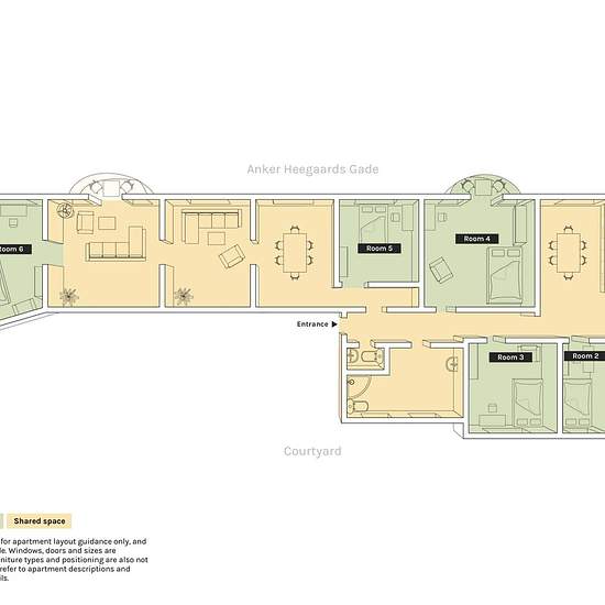 Description - space This apartment building is from 1908. It has a total of six rooms: two couple rooms and four single rooms. It has two bathrooms, one with a bathtub and a shower in it. The kitchen is enormous and has a large dining room table that can fit at least 10 people. There are around three living room spaces in this apartment, with a TV area, chill out area and a cozy area. This makes it the perfect place to do different activities or hobbies, like move nights, drawing, playing board games, reading a book or just hanging out with ...