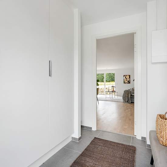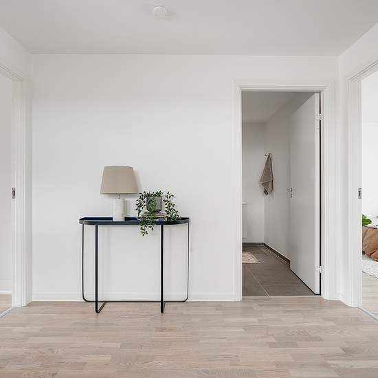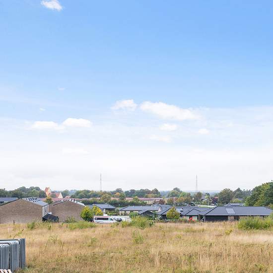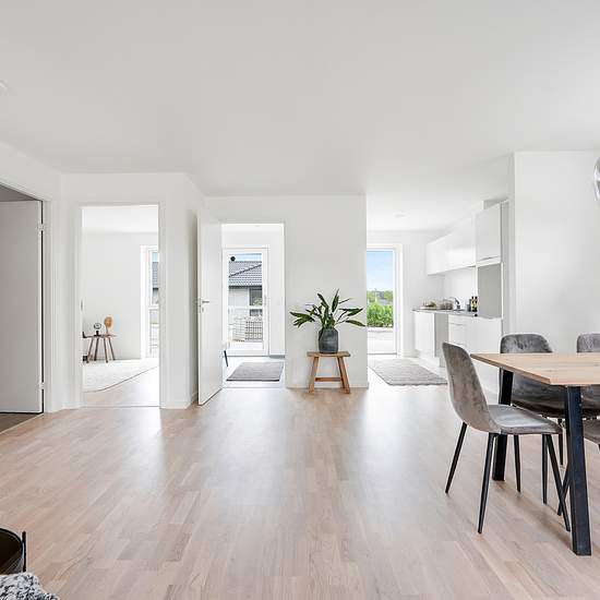 Moderne rækkehus med terrasse Dette moderne og nybyggede rækkehus byder på et stort køkkenalrum med plads til både spisebord og dagligstue. Køkken er splinternyt og fuldt udstyret med opvaskemaskine, ovn, keramisk kogezone, emhætte og køle/fryseskab. De store vinduer i stuen giver et godt lysindfald, og fra stuen er der direkte adgang til den private terrasse via de store dobbeltdøre. De to værelser er rummelige og lyse, og de indeholder begge indbyggede skabe. Også badeværelset er moderne med flotte grålige klinker og bruseniche. Derudover...