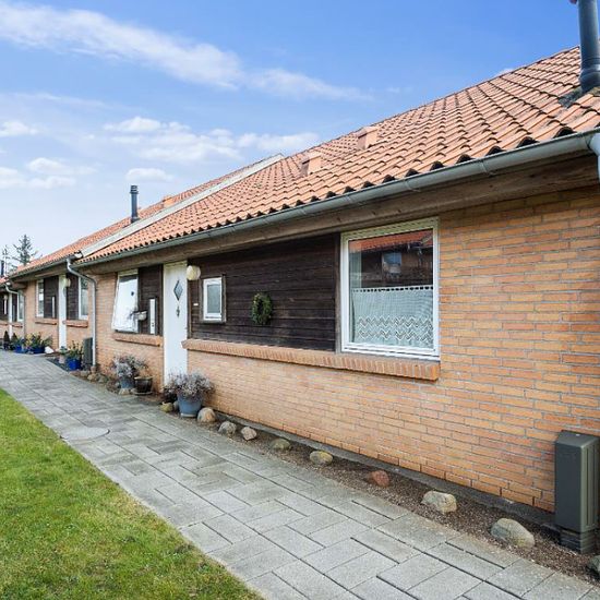 Attraktivt rækkehus i et plan fra 2004 på 73 m2 beliggende i V. Aaby. Indeholdende: Entre, køkken i åben forbindelse til stue, stort badeværelse samt 2 værelser med indbyggede skabe. Der er netop lagt nye gulve i stue, køkken og værelser. Køkkenet er udstyret med køle-fryseskab, emhætte samt komfur. Det tilbydes at indsætte opvaskemaskine samt vaskemaskine for udlejers regning. Tilhørende have, skur til opbevaring samt parkering. El + varme afregnes direkte med forsyningsvirksomhederne. Energimærke: C Billeder er fra tilsvarende bolig