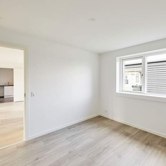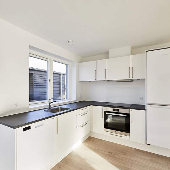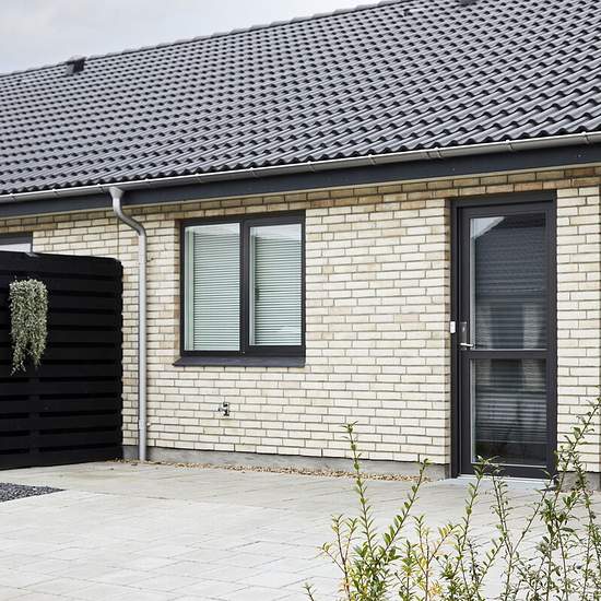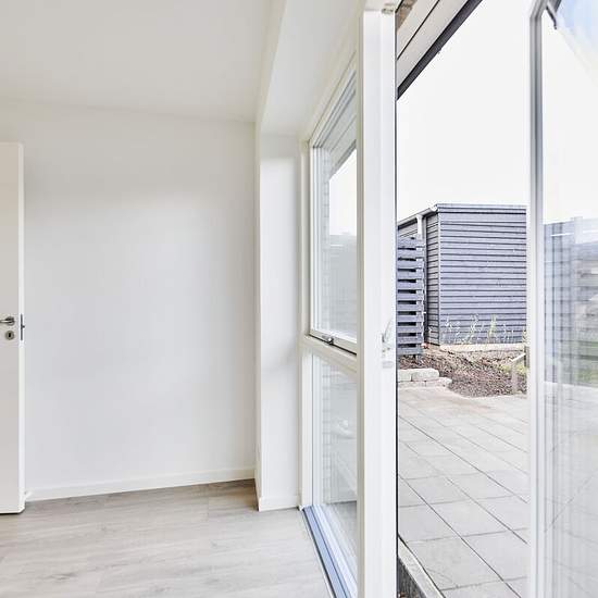 Velkommen indenfor i et lyst og roligt hjem, hvor planløsningen gør hverdagen nem. Du træder ind i en indbydende entré, der samler boligen og leder dig direkte til det store køkken/alrum/stue. Her er god bordplads i køkkenet, naturlig plads til langbordet og en blød stuezone, hvor lyset får lov at fylde rummet. Terrassedøren åbner ud til en flisebelagt terrasse og et afskærmet uderum – perfekt til morgenkaffe, havekrukker og de lange sommeraftener. I husets stille del ligger to gode værelser på ca. 10,5 m² og 11,2 m². De fungerer lige fint...