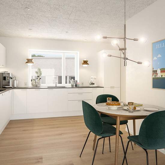 3-værelses Rækkehus på 95 m² i Jelling Havegangen 23, 7300 Jelling Haverne Jelling - Lejemålsnr. 9-666-41 Velkommen til Haverne i Jelling – moderne étplansrækkehuse i naturskønne omgivelserI Haverne finder du 57 lyse og velindrettede rækkehuse i ét plan, opført med fokus på kvalitet og funktionalitet. De rummelige boliger byder på troldtektlofter, der sikrer behagelig akustik, og en gennemtænkt indretning, hvor lys, komfort og hverdagsliv går op i en højere enhed. I denne 3-værelses lejebolig får du: Entre/ bryggers med vaskemaskine & tørret...