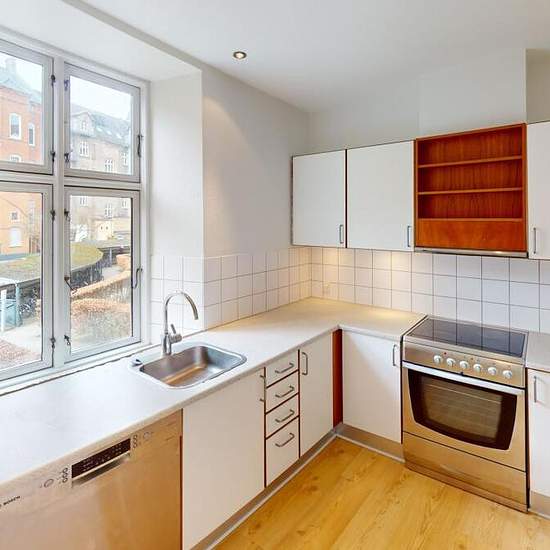 Lejligheden indeholder et lyst køkken med udsigt til det hyggelige gårdmiljø. Badeværelset er ligeledes lyst med skabsplads under vasken og separat brusekabine. Lejlighedens 3 værelser er rummelige og lyse. De egner sig perfekt til en stor fælles stue med masser af plads til sofagruppen og spisebordet samt to store soveværelse hvor I får rigeligt med plads til både den store dobbeltseng skrivebord og påklædningsskab.