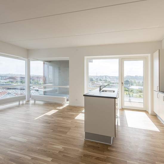 Velkommen til denne lejlighed hvor lys møder en unik beliggenhed. En indflytningsklar bolig med en behagelig atmosfære. Lejligheden ligger på 7. sal i en flot ejendom med elevator og byder på en fantastisk udsigt. Her finder du et åbent køkken og stue med store vinduespartier, som skaber et lyst og indbydende rum. Det rummelige soveværelse har god skabsplads, mens det store værelse kan anvendes til gæster eller kontor. Badeværelset er rummeligt og udstyret med lyse klinker og gulvvarme, hvilket tilføjer en ekstra komfort. Ejendommen Til le...