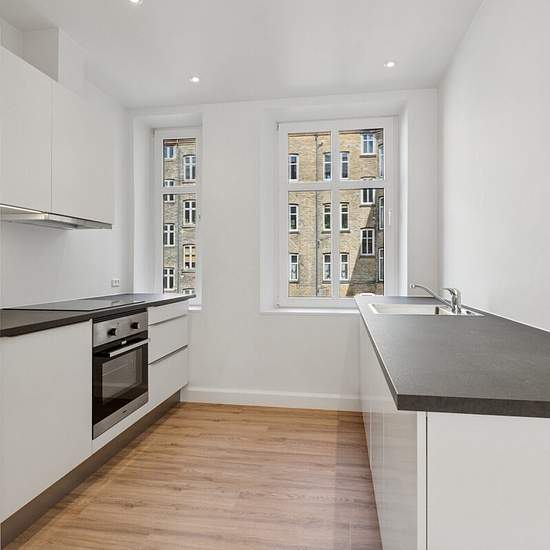 Denne smukke lejlighed nær Louise Plads er netop totalrenoveret og står klar til nye beboere, der ønsker en lys, moderne og funktionel bolig med gennemtænkte detaljer og kvalitetsmaterialer. Lejligheden byder på et helt nyt, hvidt køkken i tidløst design, udstyret med alt i hårde hvidevarer: Stort køle-/fryseskab Induktionskogeplade Indbygningsovn Emhætte Opvaskemaskine Køkkenet ligger i åben forbindelse med alrum og stue og skaber et lyst og indbydende opholdsrum, der indbyder til både afslapning og samvær. Det nye badeværelse er ud...