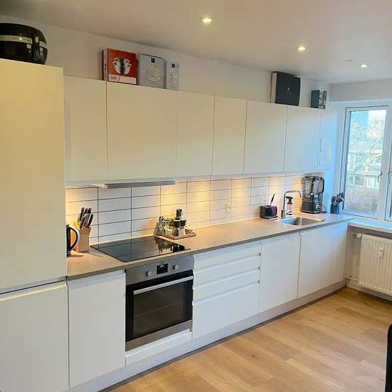 Velkommen til denne lejlighed hvor lys møder rummelighed. En indflytningsklar bolig med en behagelig atmosfære. Du bydes velkommen i den rummelige entré, der leder dig ind i lejlighedens hjerte – et stort og åbent køkkenalrum og stue. Dette område udgør et perfekt rum, hvor både madlavning og afslapning kan forenes. Det stilfulde køkken er udstyret med moderne faciliteter og masser af både skabs- og bordplads, mens stuen med sine store vinduer er badet i naturligt lys og udstråler en indbydende atmosfære. Herfra har du også udgang til den l...