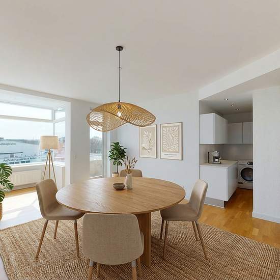 Når man træder ind i lejligheden kommer man direkte ind i den lyse entré hvorfra der er adgang til badeværelset samt det store køkken/alrum og stue i et. På badeværelset er der hvide klinker væghængt toilet skabsplads under vasken samt stor separat brusekabine. I det store køkken-alrum som ligger i åben forbindelse til stuen er der masser af plads at boltre sig på. I køkkenet er der både opvaskemaskine og vaskemaskine samt masser af skabsplads til alt køkkengrejet. I den store åbne stue er der udgang til den store altan hvor der er udsigt ud...