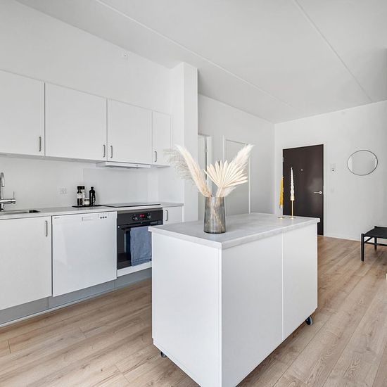 Attraktiv lejebolig med altan, der vender ud mod den, grønne og dejlige gårdhave, hvorfor det er muligt at nyde altanlivet uden at blive generet fra gadestøj. Lejligheden har et rummeligt alrum, der giver god mulighed for at indrette sig. Derudover er den topmoderne med lyse materialer og tilhørende opvaskemaskine, emhætte og indbygget ovn. Derudover gulvvarme i hele boligen samt vaskesøjle i badeværelset. Der er elevator i bygningen og der er et tilhørende opbevaringsrum til boligen. I kælderen er der mulighed for parkering til cykler samt ...