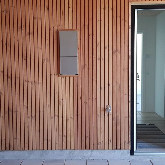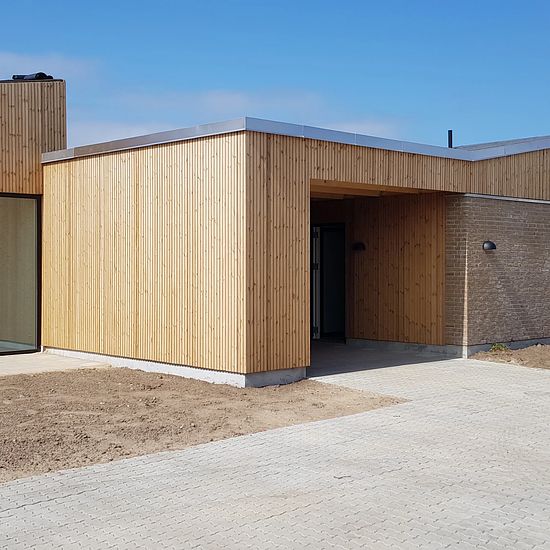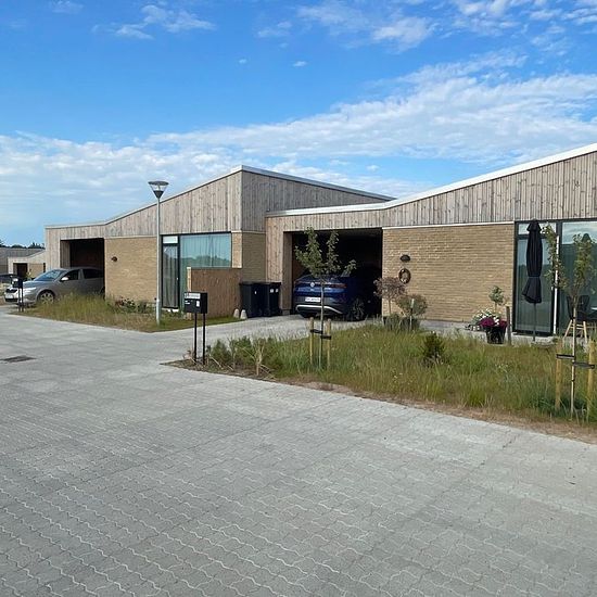 Flotte moderne rækkehuse, midt i byen og tæt på naturen. Veldisponerede 3. værelses rækkehuse på 90 m2. i ét plan. Husene ligger i små klynger, og er adskilte af en carport. Husets hovedindgang ligger i forbindelse med carporten, så man kan komme tørskoet ind fra bilen. Bagerst i carporten findes et skur til opbevaring af fx. haveredskaber. Huset har en stor entré hvorfra der er adgang til badeværelset. Fra entréen kommer man ind i et stort køkken/alrum som ligger i åben forbindelse med stuen. Fra stuen er der udgang til en flisebelagt terra...